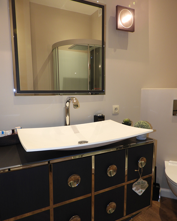 La salle de bain « couture » possède une douche à l’italienne, un WC, un lavabo.